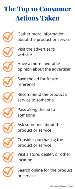 According to MNI Targeted Media, 80% of consumers seek more information about an ad that they find interesting. And that’s just one action consumers are inclined to take upon seeing an ad. According to a Triad report, newspaper ads drive strong consumer reactions.